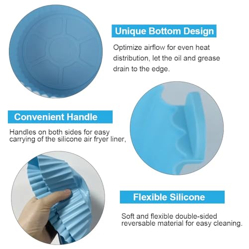 - [100% Food-Grade Silicone Pot] – round air fryer liners are made of food-grade silicone, which is oil-proof & heat resistant, withstands temperatures up to 450°F. Won’t affect the taste of the food at all! The Soft silicone also makes it easy to hand wash.